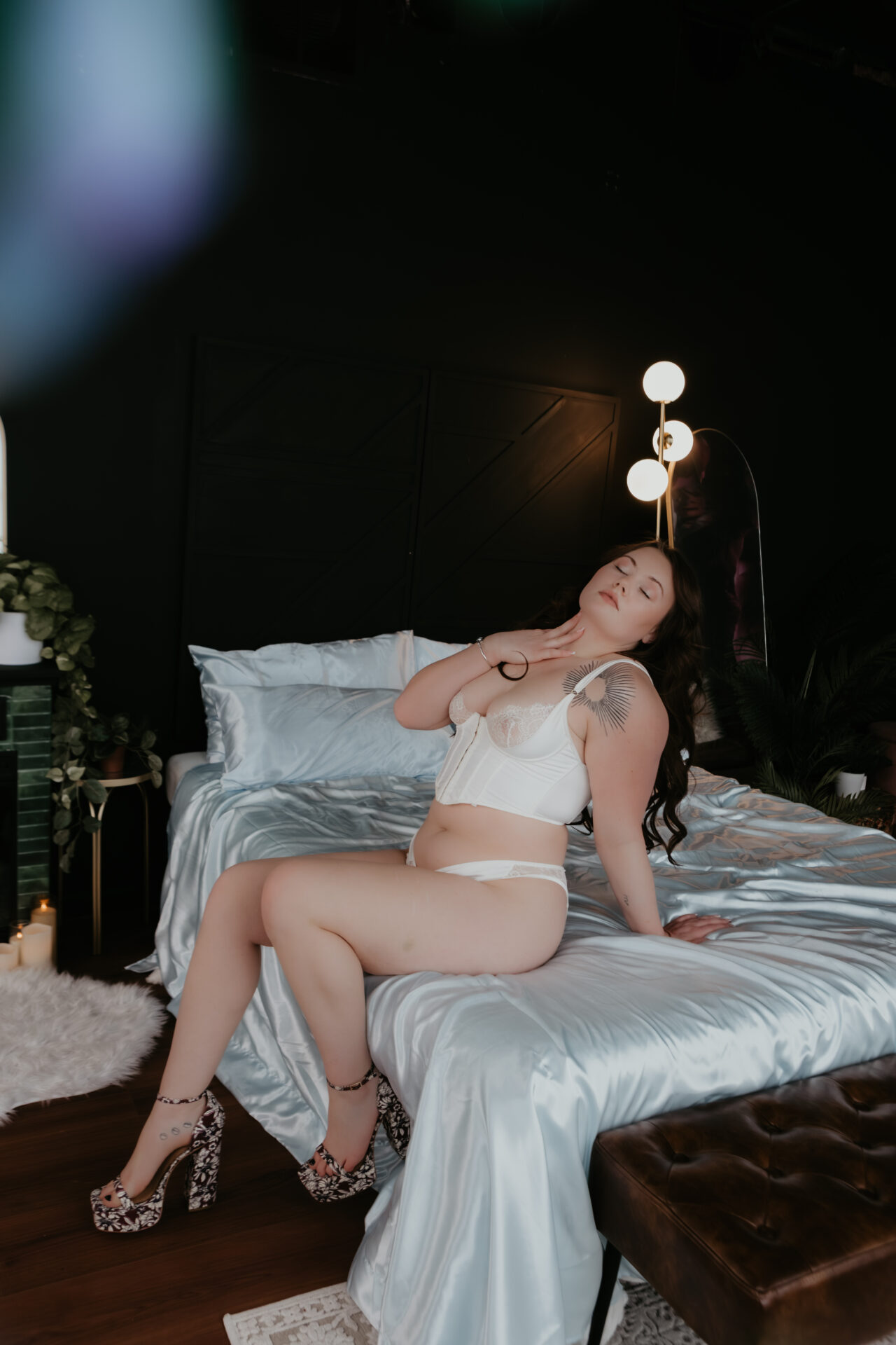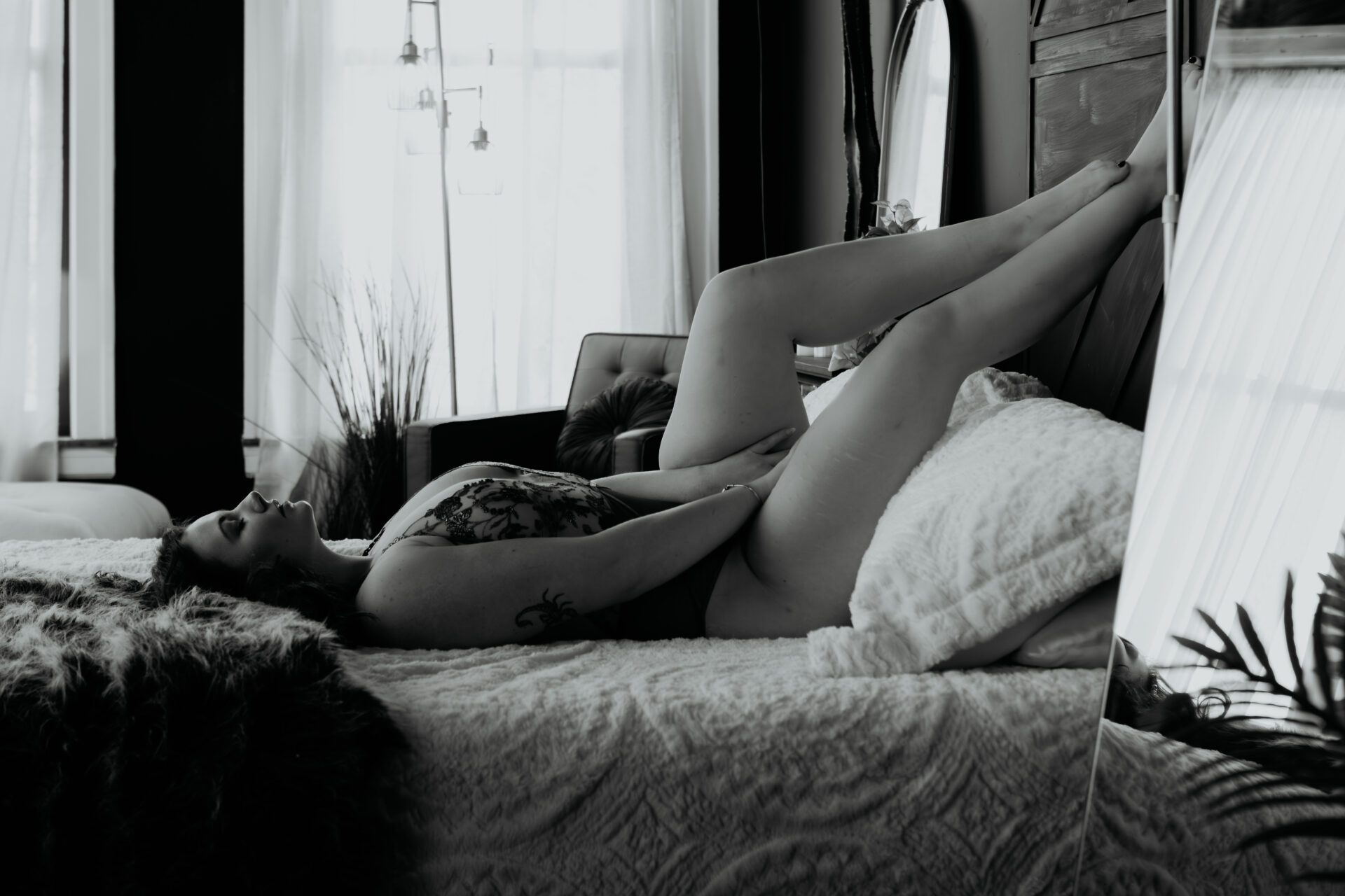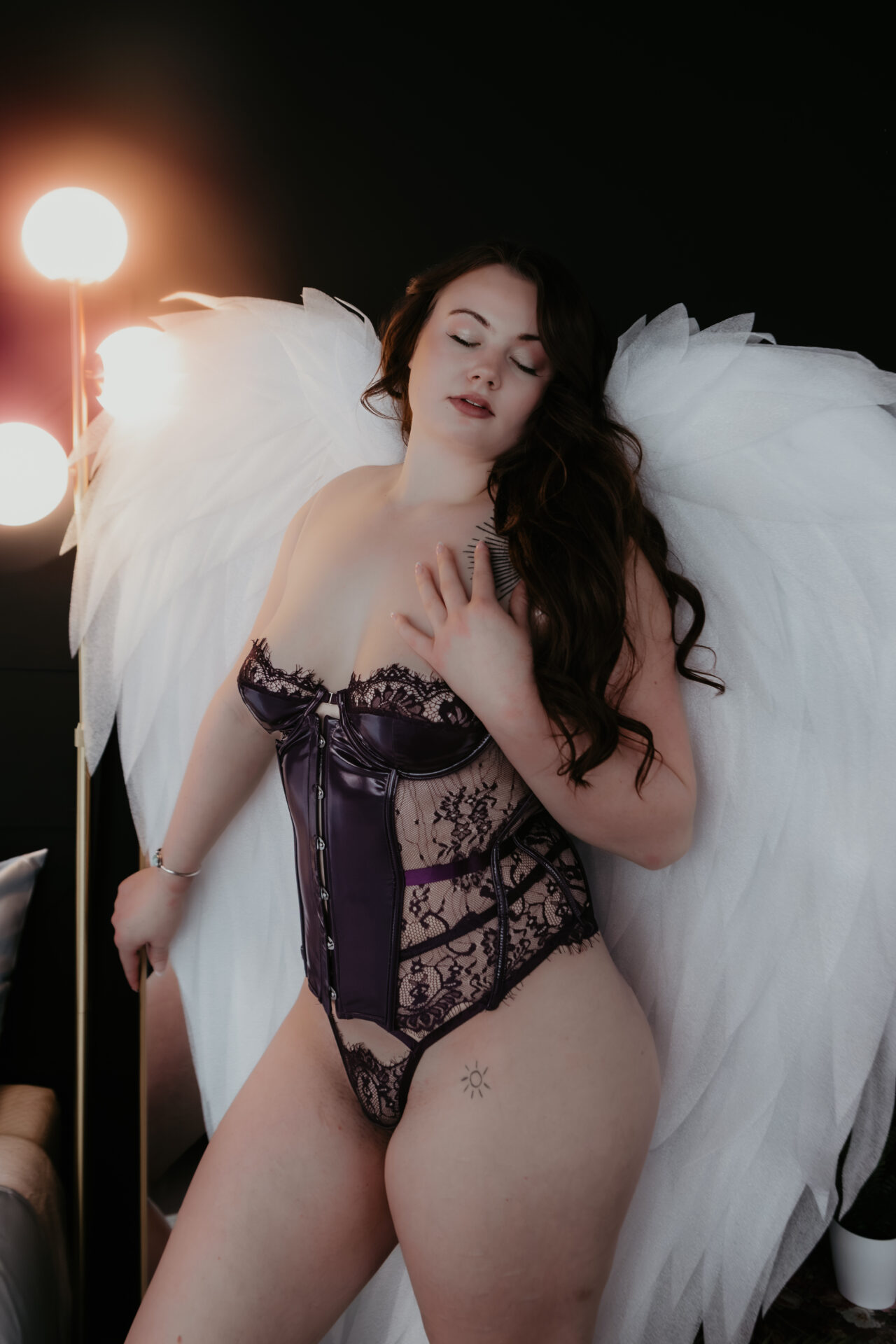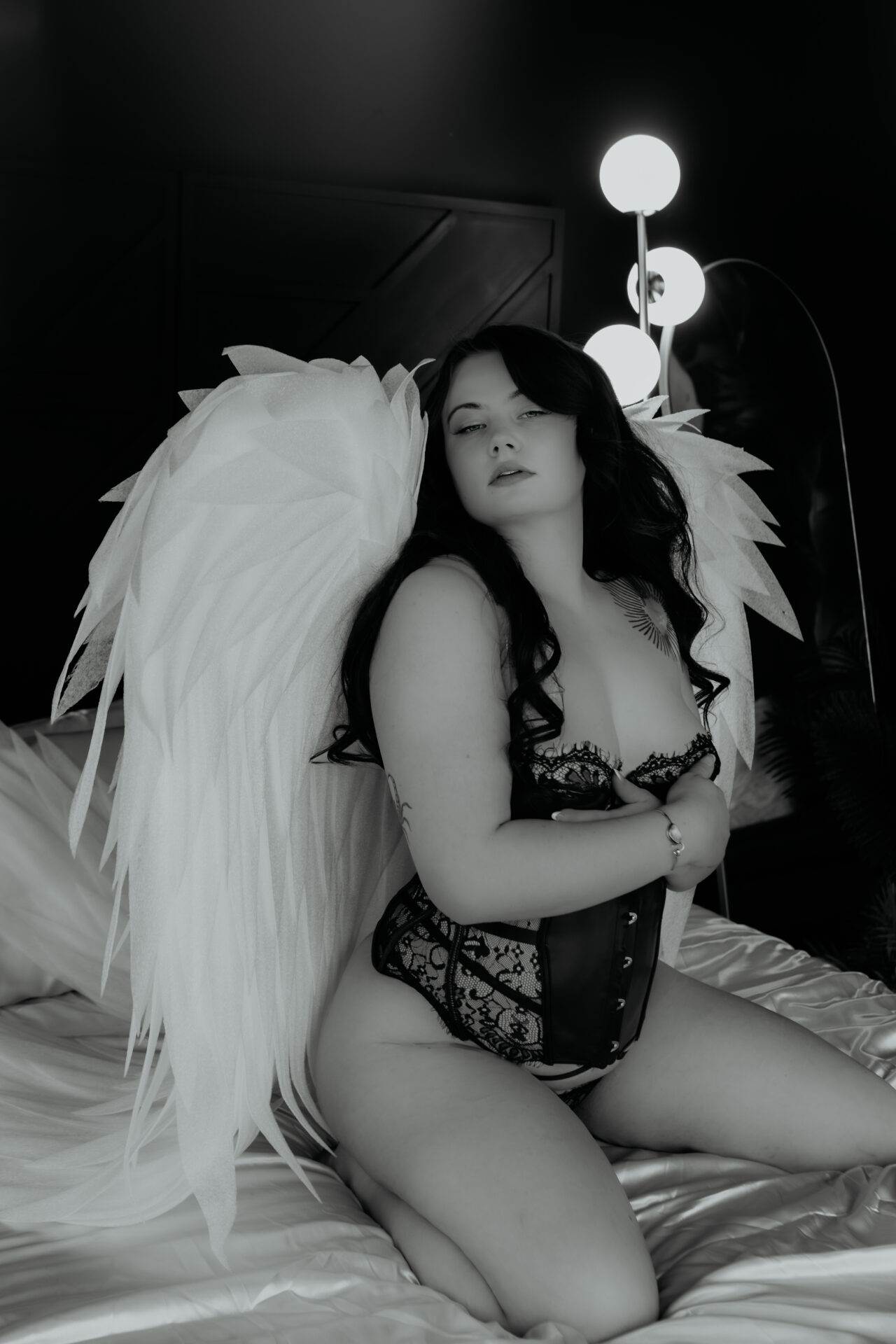 Soft, moody, and a little bit celestial, this Michigan boudoir session blended angel wings, rich lace, dreamy light, and intimate posing for a gallery that feels both sensual and ethereal.