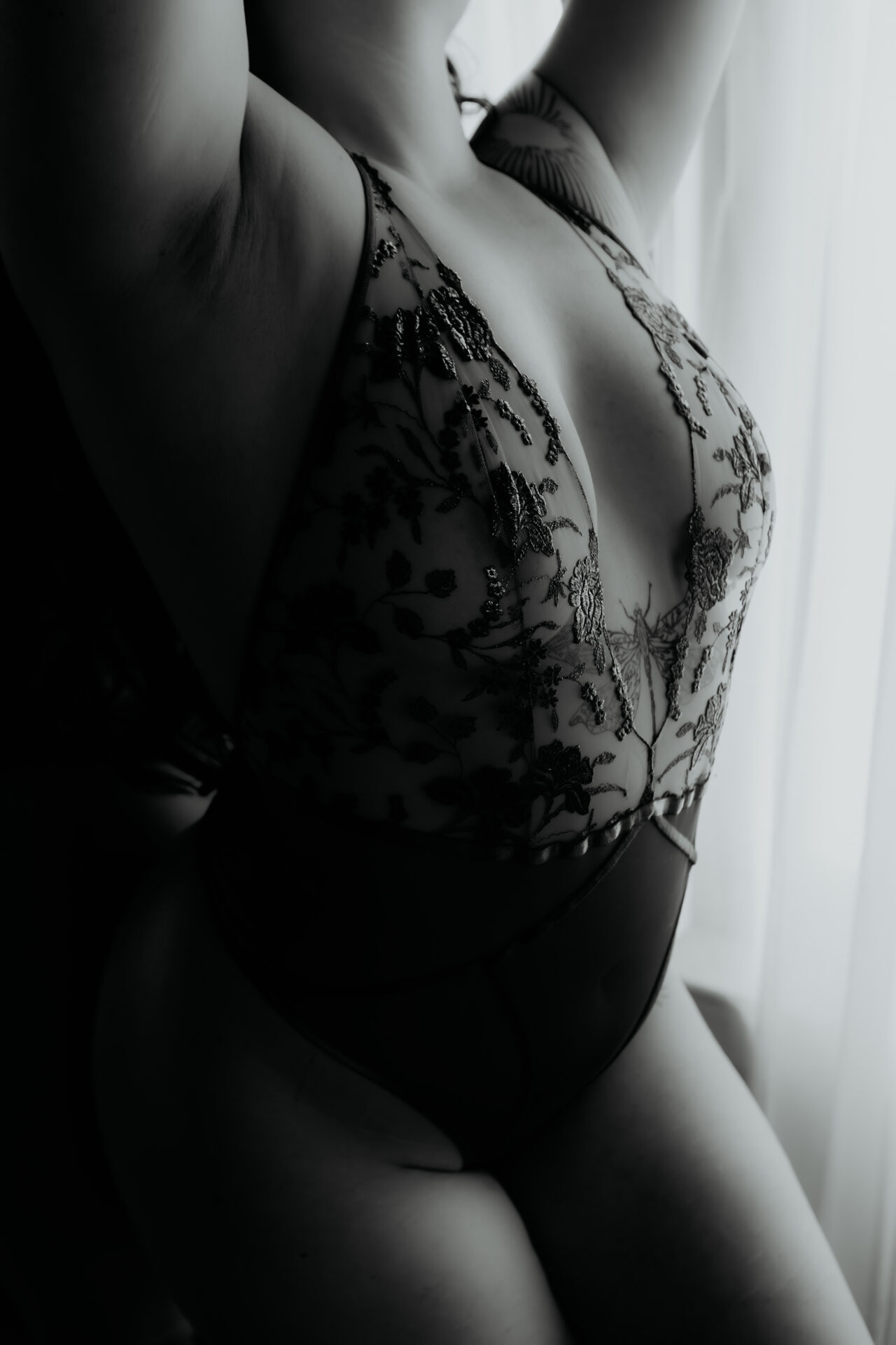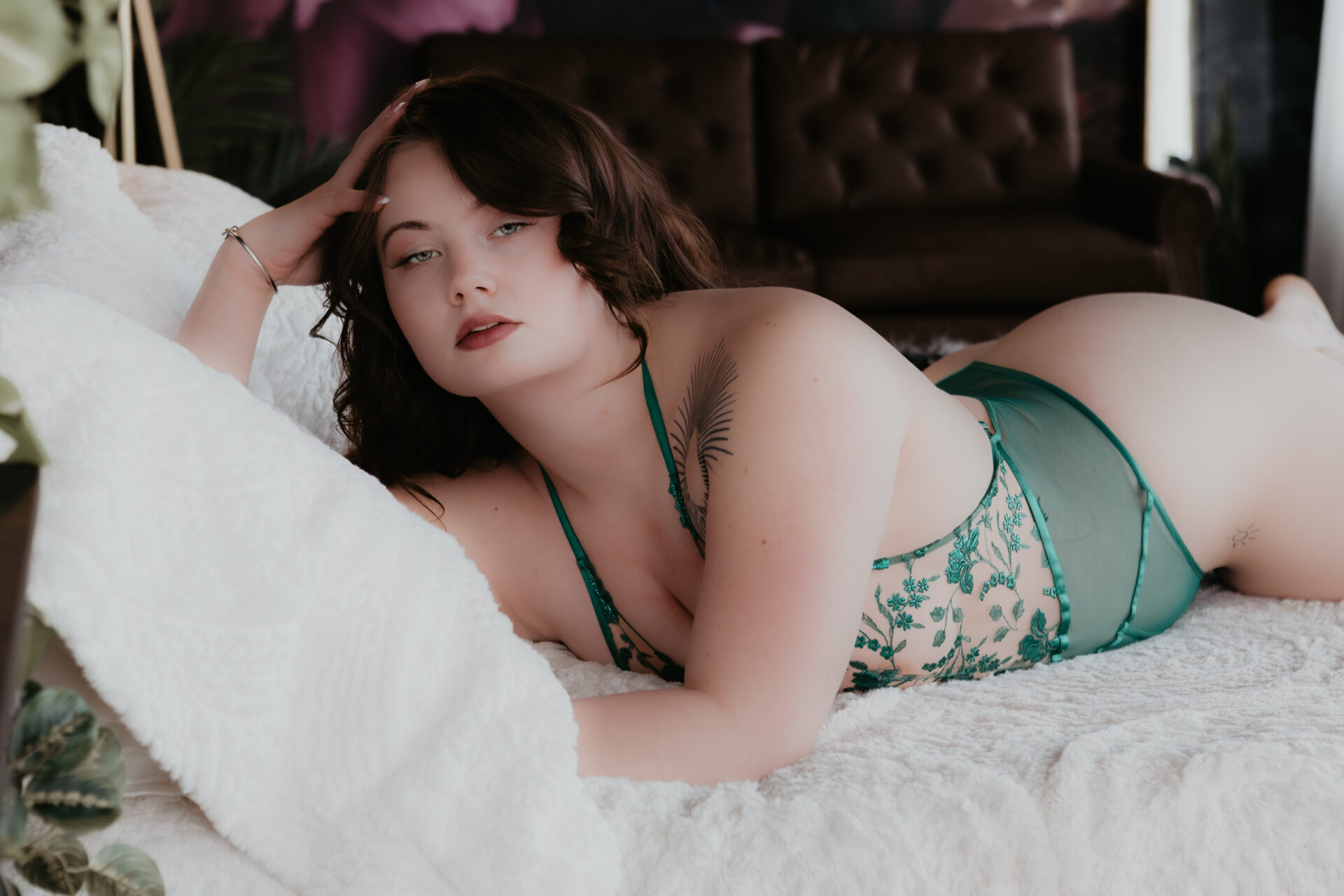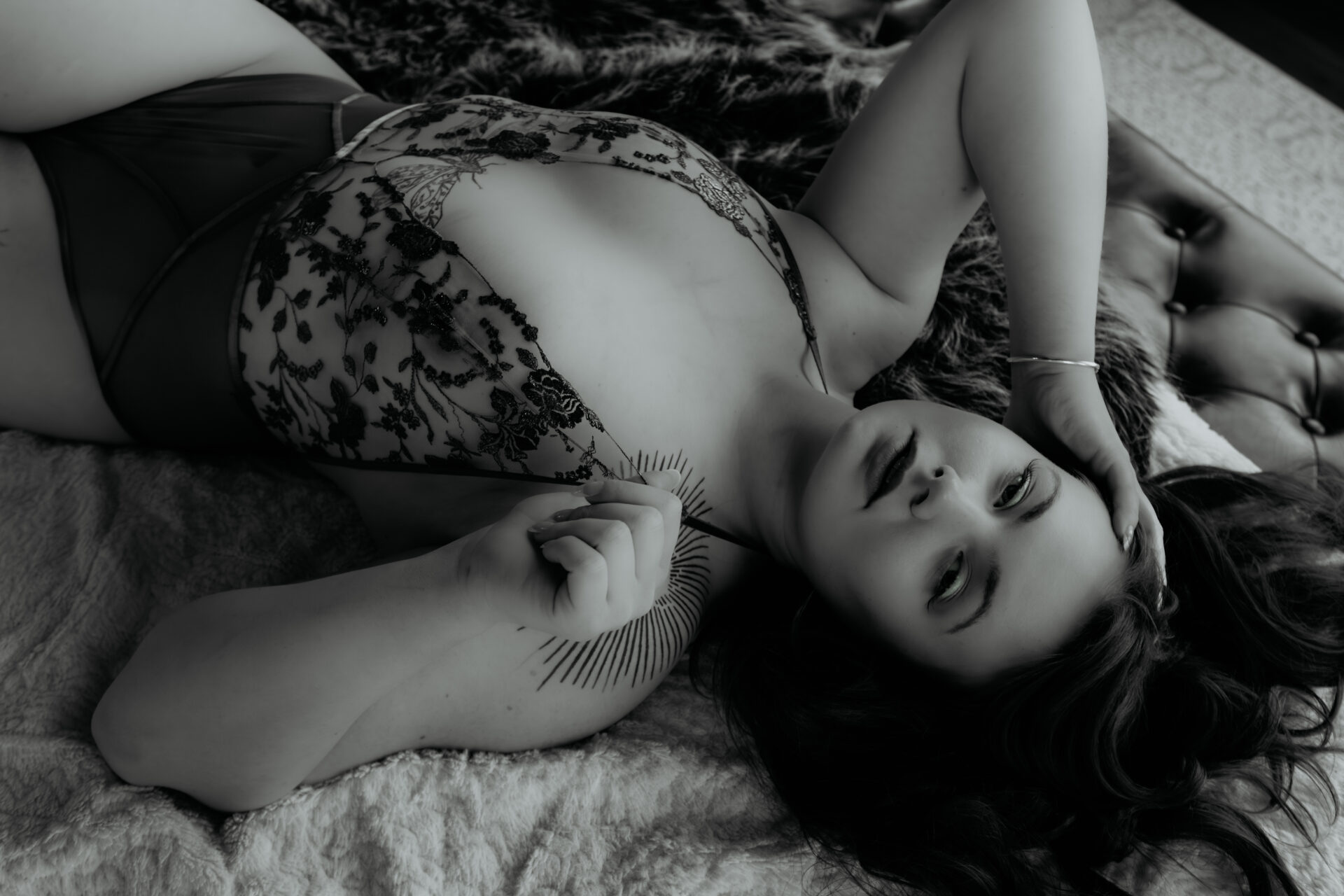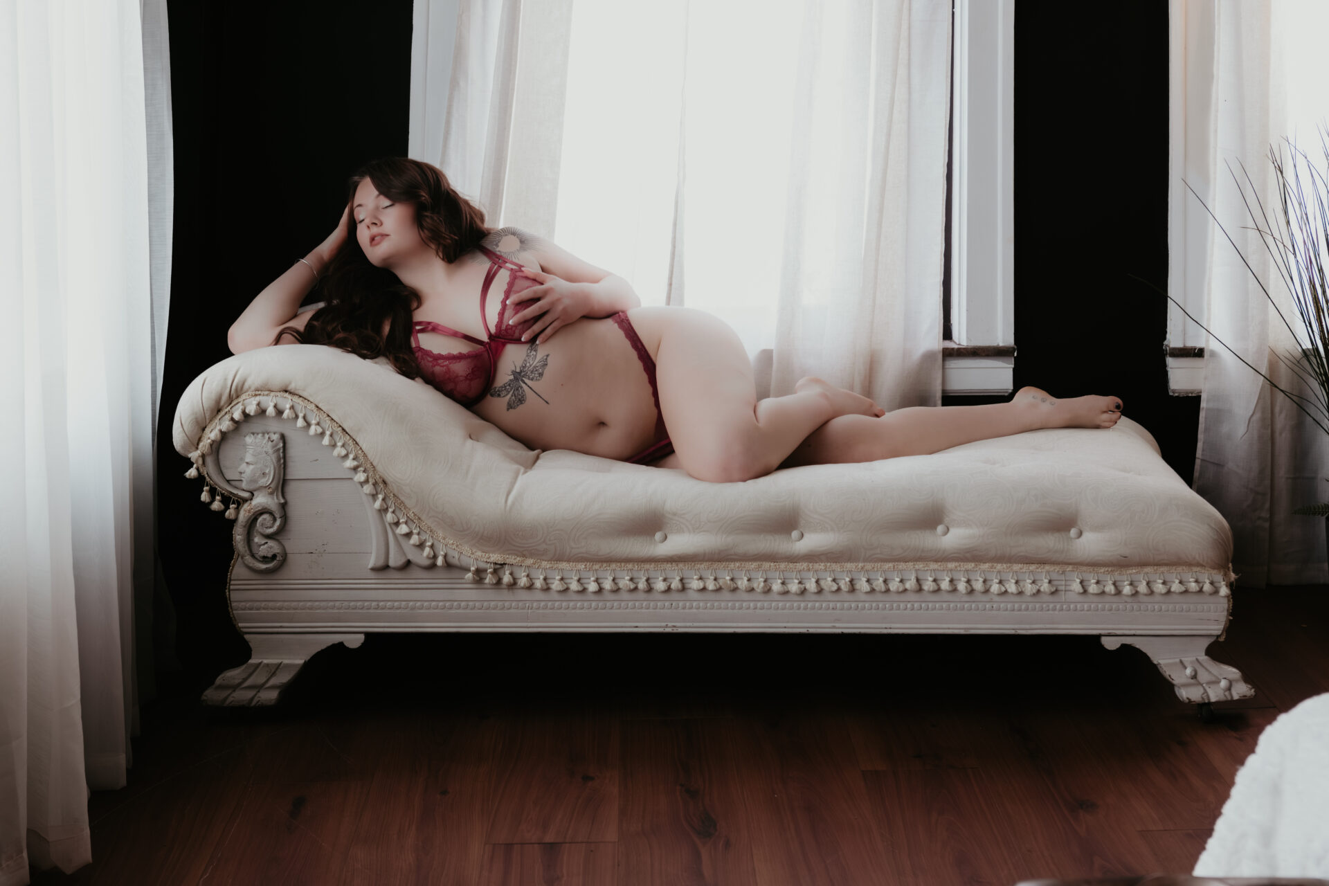 Soft, moody, and a little bit celestial, this Michigan boudoir session blended angel wings, rich lace, dreamy light, and intimate posing for a gallery that feels both sensual and ethereal.