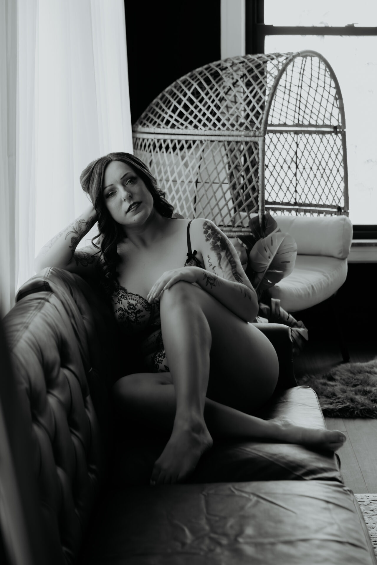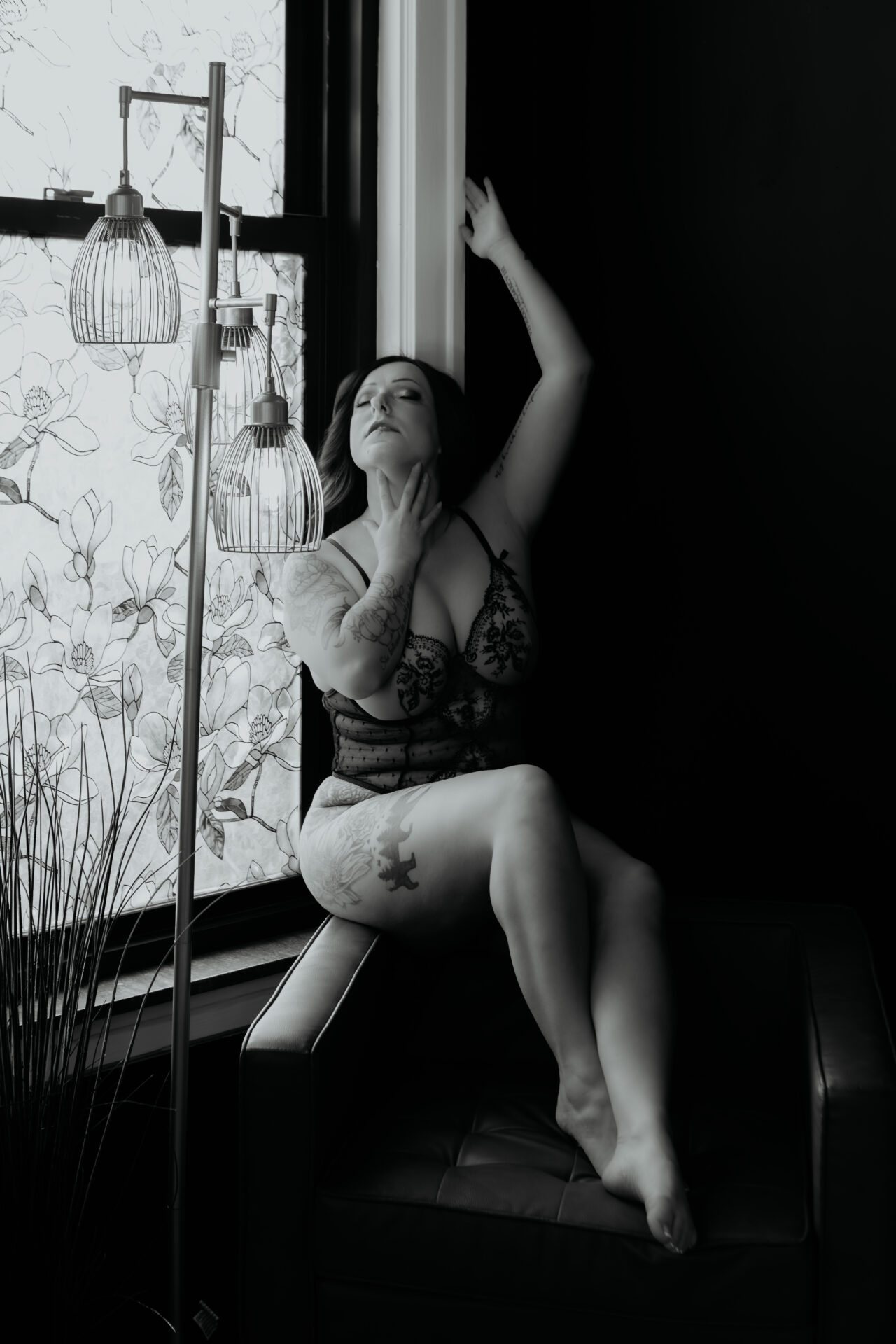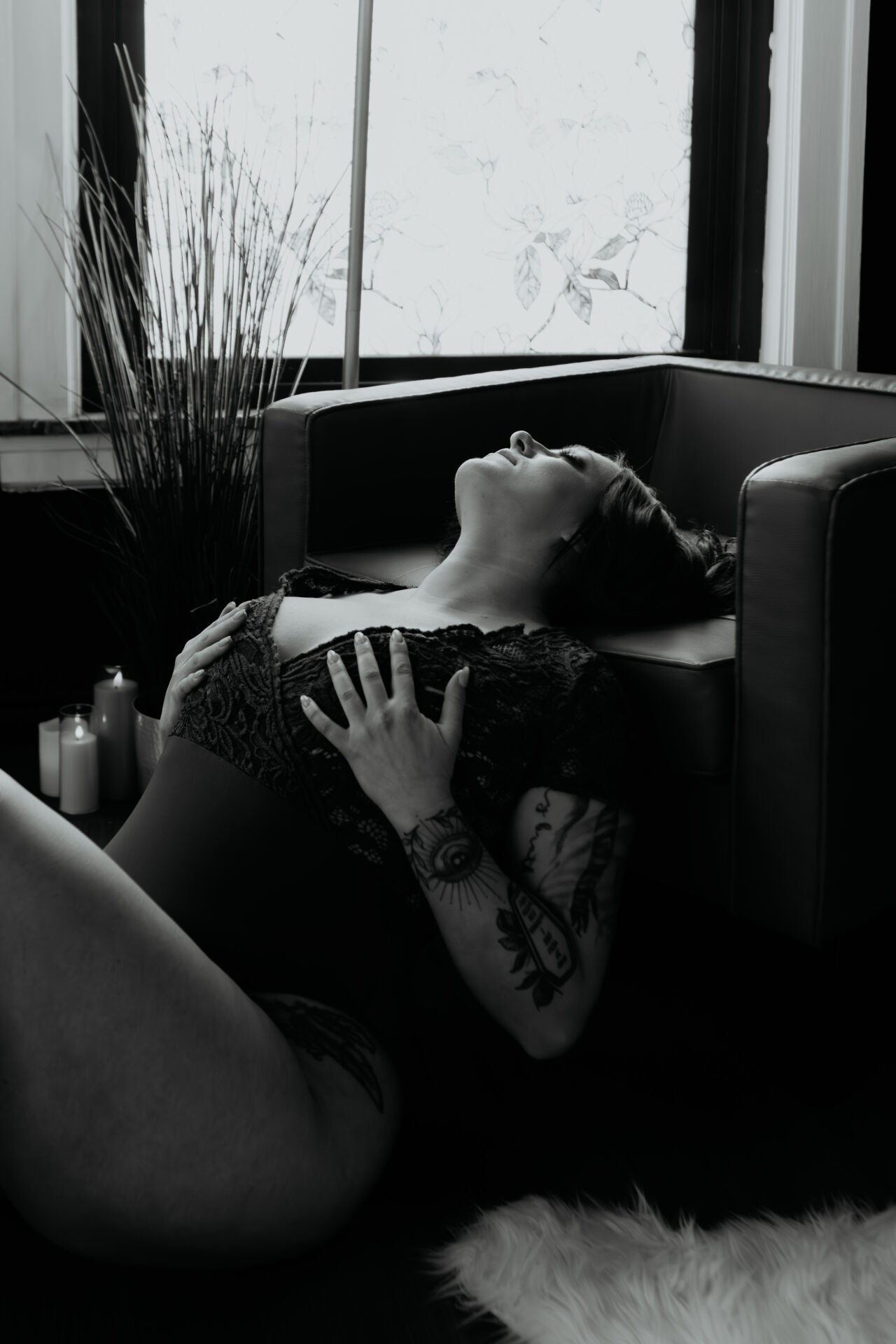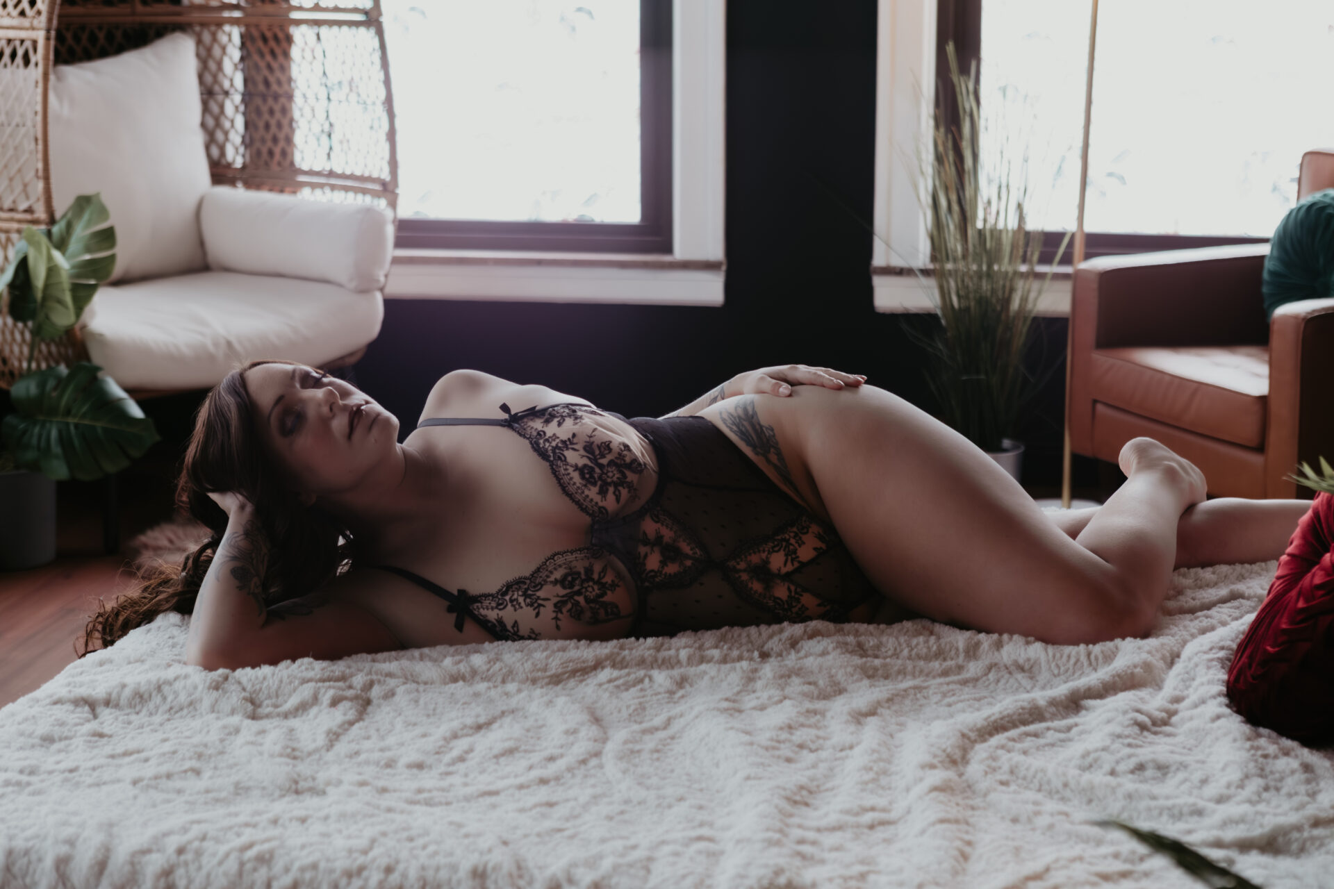 This boudoir gallery is rooted in honesty, softness, and embodied confidence. Photographed in natural light inside my Bay City Michigan studio, this session focuses on real curves, lived in skin, and quiet sensuality without forcing shapes or hiding texture. Every pose is intentional but uncompressed, allowing the body to rest, stretch, and exist as it is. This is boudoir for women who want images that feel intimate, grounded, and deeply personal rather than performative.